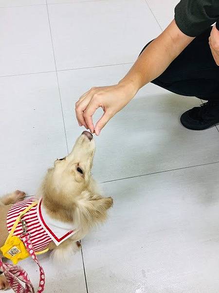 今天的小練習: 稱讚毛孩,給零食,讓她習慣叫名字會注意主人、覺得是好的事情